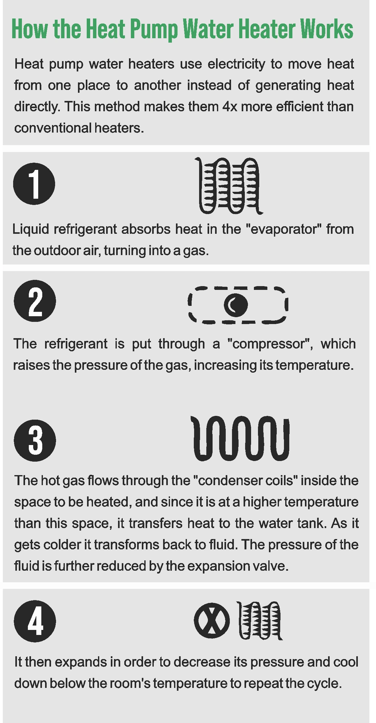 Heat pump water heaters works on principle just like an air conditioner or like the refrigerator. It absorbs warmth from the air and transfer it to heat water.